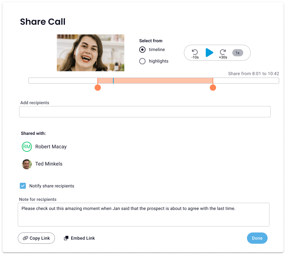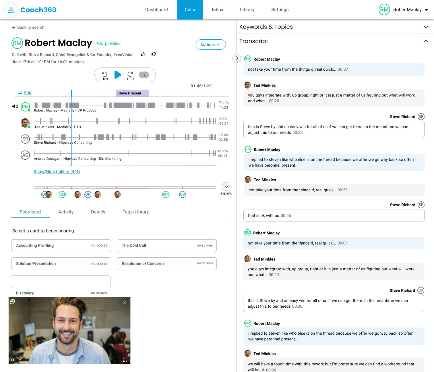 This was a complete redesign of an existing video call recording interface. Several elements of existing functionality had to be maintained. Snippet highlighting, commenting, sharing, keywords and text dictation were all preserved in a condensed and rich interface.